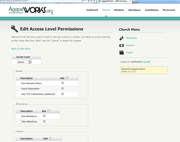 Need to let someone else run the church’s profile for awhile? Just switch the person’s permissions on the Access Levels page and you’re set. This page allows profile administrators to set each member’s permissions, access level and status within the system with a simple click, and to make sure that the only people viewing your church’s private information are the ones who should be. |