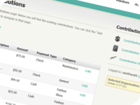 Use the Contributions page to track all of your church’s contributions on as regular a basis as you like. Weekly contribution totals can be entered and saved here, then viewed all at once to easily track contribution amounts, types (check, cash, etc.), what they were given toward (ministries, projects, missions, etc.). |